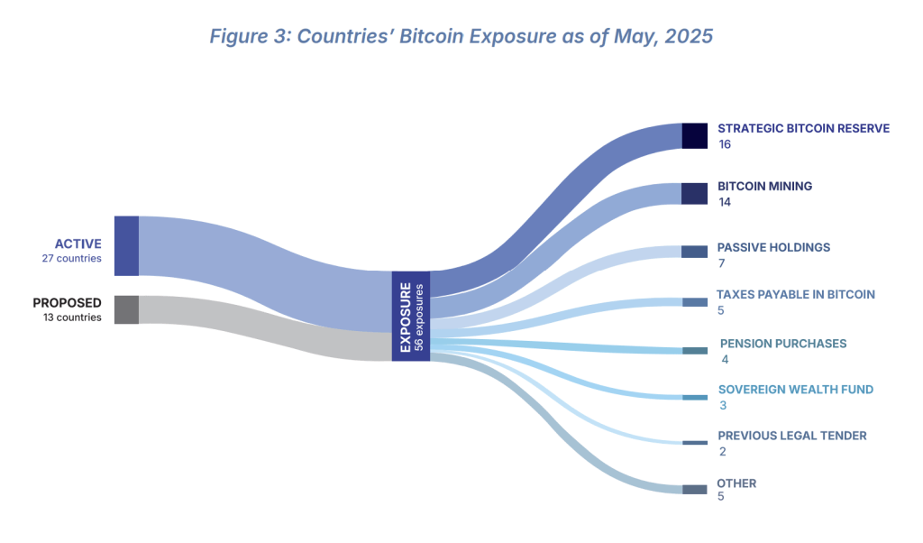 Bitcoin đang bước vào giai đoạn mới trong tiến trình được các quốc gia chấp nhận. Nếu giai đoạn trước chỉ có vài nước thử nghiệm như El Salvador, thì nay đã có 27 quốc gia có tiếp xúc trực tiếp với Bitcoin (sở hữu, sử dụng,…) và 13 quốc gia khác đang soạn thảo luật để tham gia. Các hình thức tiếp xúc không chỉ dừng lại ở việc công nhận làm tiền pháp định, mà đã mở rộng sang dự trữ chiến lược, khai thác, quỹ hưu trí, quỹ đầu tư quốc gia và thuế Bitcoin. Xu hướng này cho thấy Bitcoin đang trở thành một tài sản vĩ mô toàn cầu mới, có thể cạnh tranh vị thế với vàng và trái phiếu chính phủ.
