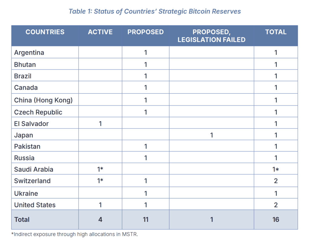 Trong số các hình thức tiếp xúc, phổ biến nhất là dự trữ chiến lược Bitcoin. Bảng thống kê cho thấy 16 quốc gia đã hoặc đang đề xuất xây dựng quỹ dự trữ bằng BTC.
