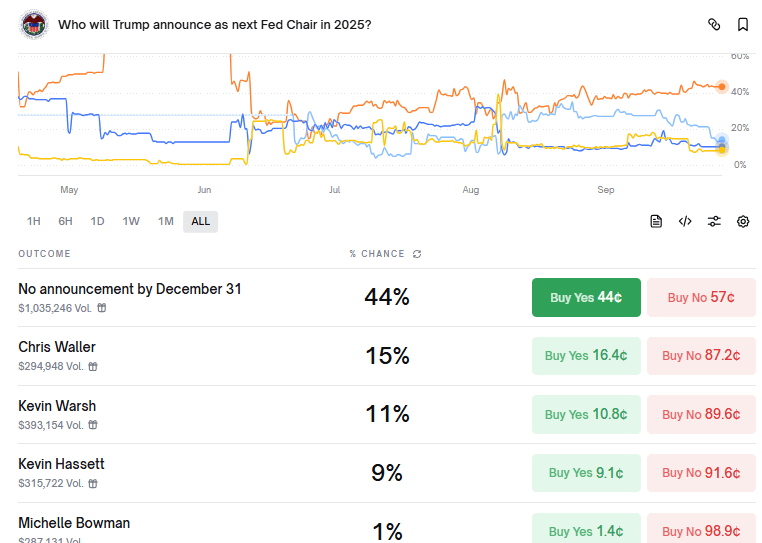 Trên nền tảng Polymarket, người dùng đang đặt cược 15% khả năng Waller sẽ trở thành Chủ tịch Fed mới (người đang có số phiếu cao nhất), trong khi 45% tin rằng chưa có quyết định nào được công bố trước cuối năm 2025.